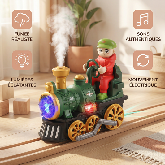 Jolie locomotive jouet avec lumière, musique et effet de vapeur