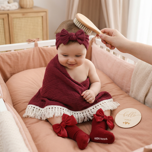 Coffret cadeau de soins pour bébé – Serviette, chaussettes ou bandeau & brosse de bain pour nouveau-né